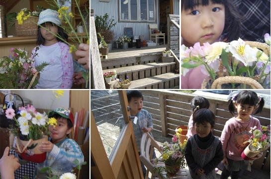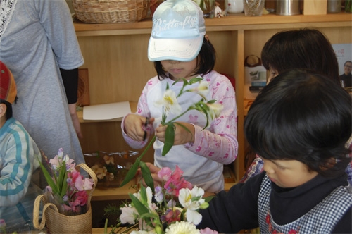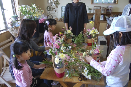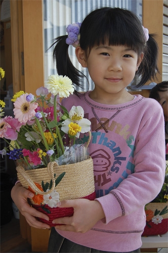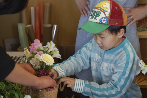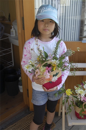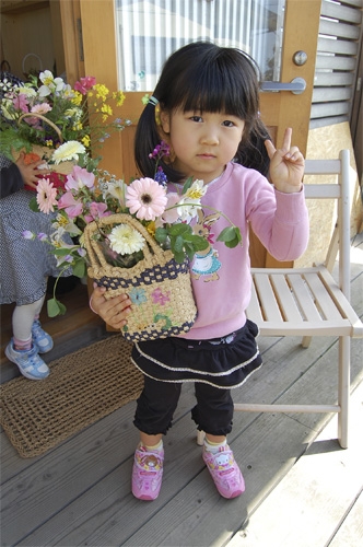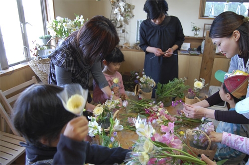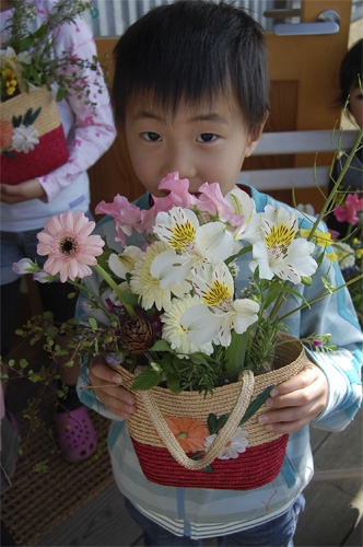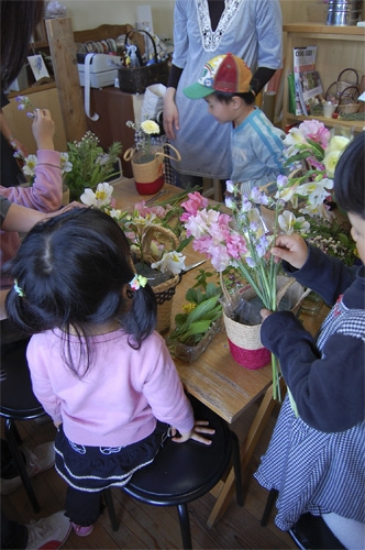 工房が準備した花と、こども達が摘んできたやさしい春の花でバスケットを飾ります。