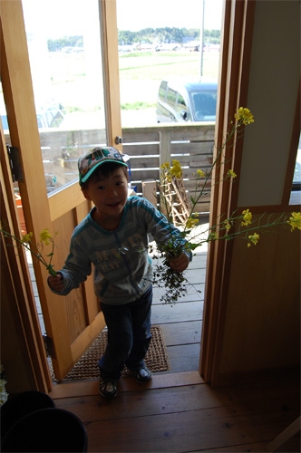花が足りないかなと思うやいなや、裏庭から調達!はじめは変かなと思っていた背の高い菜の花も、完成に近づくとなかなかのものに仕上がりましたよ。作品と一緒に写った記念写真をご覧あれ。