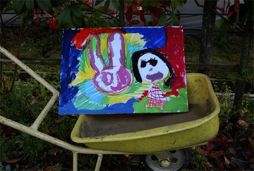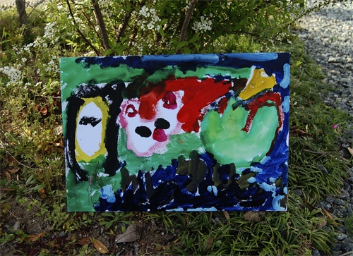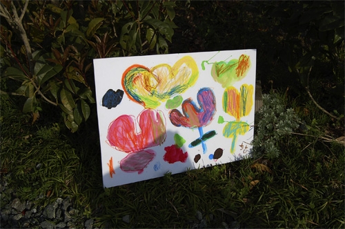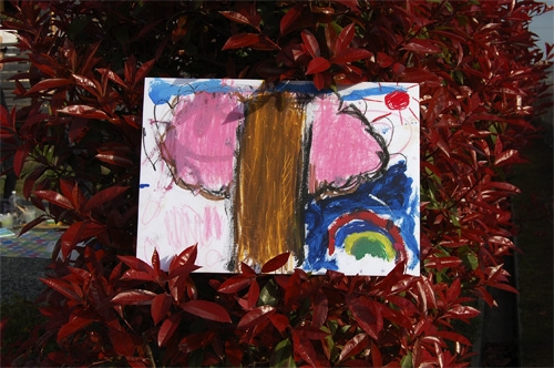 2010年4月10日春盛り、汗ばむほどの土曜日です。今日はフラワーアレンジとお絵かきというジョイント・ワークショップのお誘いをいただき、画材一式をかついで出張レッスンとなりました。こどもたちもKaenの愛犬Colonも元気いっぱい良くできました!