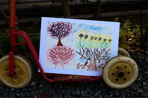 アレンジの後はお店の駐車場に出てお絵かきです。題材は自由でしたが、この陽気に誘われたのか、みんな思い思いに春を描いてくれました。モデルを頼んだ愛犬Colon…モデルとしては人気薄(かわいそう…)